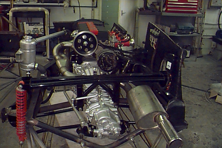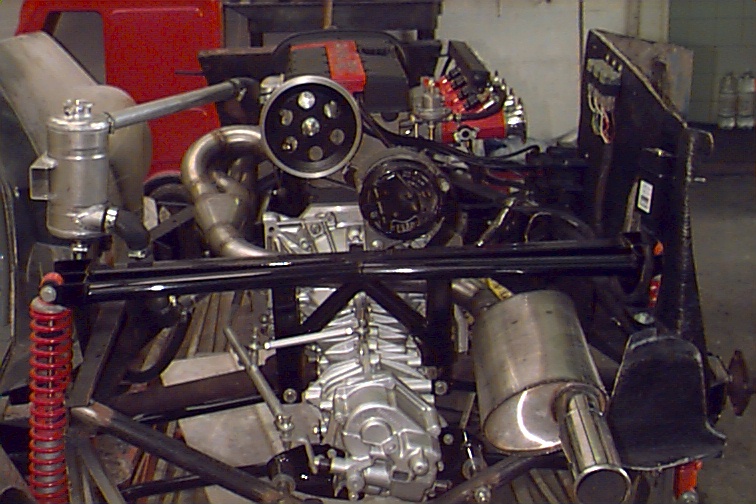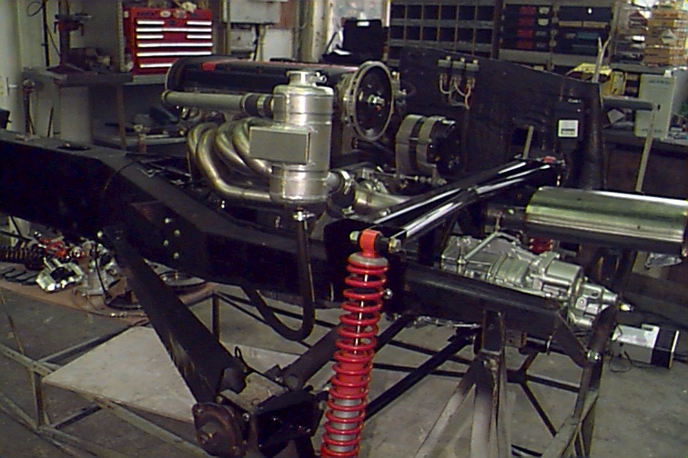 Rear view showing new exhaust, gearbox and shift linkage as